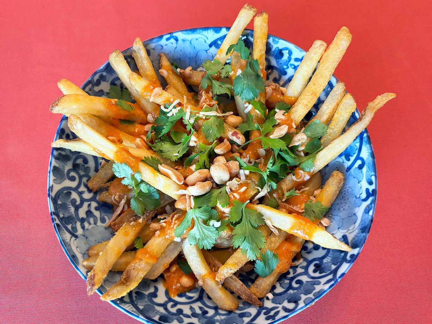 So, this weekend, while we recovered from Halloween, I played with a dish I’ve been thinking about ever since my trip to New York this summer: Thai disco fries. If you’re not familiar with the term “disco fries,” it’s a snack you’ll find in diners on the East Coast, especially in and around New Jersey, made of fries covered with gravy and melted mozzarella. (It’s basically a diner version of poutine, the Québécois dish of fries, gravy, and cheese curds.) I haven’t dug into the history, but I assume the dish is “disco” because it’s a great late-night food, ideal for soaking up a night of drinks (and adding fuel after dancing).
